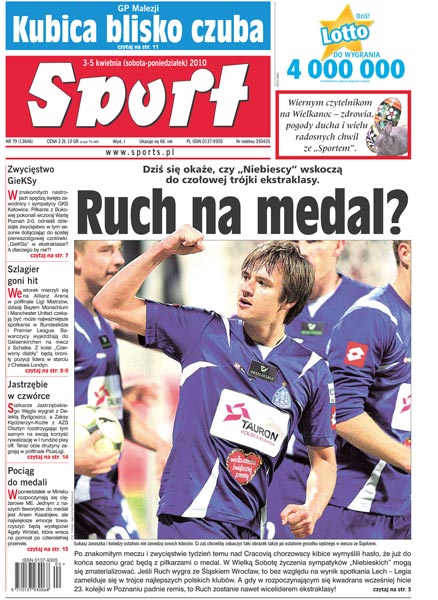 Ruch ma szansę wskoczyć do czołowej trójki ekstraklasy; GKS Bełchatów nie dał żadnych szans Odrze Wodzisław; rozmowa z Ryszardem Tarasiewiczem, trenerem Śląska Wrocław; szlagier kolejki przy stadionie na Bułgarskiej: Lech podejmuje Legię; Piotr Mandrysz, trener Pogoni Szczecin, zaangażował psychologa, bo jego piłkarze nie wytrzymują stresu; GKS Katowice zwyciężył Wartę Poznań; w Gelsenkirchen zagra przyszły mistrz Niemiec – Schalke 04 podejmuje Bayern; Manchester United gości Chelsea, ale niemal cała Anglia w wyścigu po tytuł trzyma kciuki za... Arsenal; w wielkanocny poniedziałek startują ligi żużlowe; Lewis Hamilton najlepszy podczas obu treningów na torze w Malezji; piękny sen się skończył – po porażce z Olympiakosem Pireus Prokom Gdynia musi wrócić do krajowych realiów; Vive Targ Kielce przed meczem rewanżowym z HSV Hamburg; Jastrzębski Węgiel zagra o medale; Agata Wróbel wraca na pomost po czterech latach przerwy na mistrzostwa Starego Kontynentu.