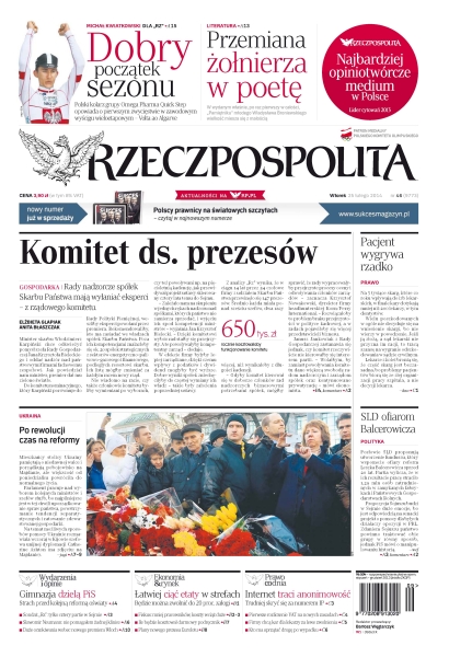 Komitet ds. prezesów – rady nadzorcze spółek Skarbu Państwa mają wyłaniać eksperci – z rządowego komitetu; po rewolucji czas na reformy – mieszkańcy stolicy Ukrainy pamiętają o niedawnej walce i porządkują pobojowisko na Majdanie, ale większość od poniedziałku powróciła do normalnego życia; gimnazja dzielą PiS – strach przed kolejną reformą oświaty; łatwiej ciąć etaty w strefach – będzie można zwolnić do 20 proc. załogi; internet traci anonimowość – trudniej skryć się za numerem IP; SLD ofiarom Balcerowicza – posłowie SLD proponują utworzenie funduszu, który wspomoże ofiary reform Leszka Balcerowicza sprzed 20 lat – partia wylicza, że w ich rezultacie pracę straciło 1,29 mln osób zatrudnionych w zamykanych fabrykach i Państwowych Gospodarstwach Rolnych; pacjent wygrywa rzadko – na 3 tysiące skarg, które co roku wpływają do izb lekarskich, w finale kary dotykają mniej niż 200 lekarzy, w tym dentystów.