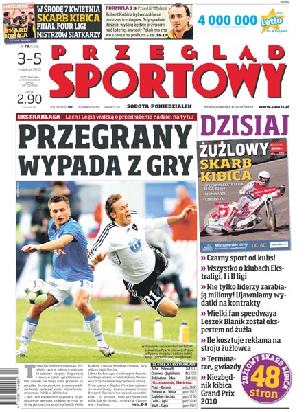 Ekstraklasa: Lech i Legia walczą o przedłużenie nadziei na tytuł – starcie tych drużyn odbędzie się w Poznaniu; tydzień z życia ligowca: Sławomir Peszko i Maciej Rybus; po zwycięstwie nad Wartą Poznań GKS Katowice jest coraz bliżej czołówki; wywiad z Jackiem Grembockim, trenerem Znicza Pruszków; ten mecz może zdecydować o losach tytułu – na Old Trafford przyjeżdża Chelsea, a Manchester musi zagrać bez Rooneya; we Francji Auxerre zagra z PSG, ale tym razem przy pełnych trybunach; Niemcy: mecz lidera z wiceliderem zadecyduje o mistrzostwie i powrocie do kadry najskuteczniejszego zawodnika Bundesligi; Robert Kubica i tropikalna ruletka toru Sepang; wywiad z Bertrandem Gille, gwiazdą HSV Hamburg; Asseco Prokom rozbudził apetyty kibiców, ale do kolejnych sukcesów w Eurolidze potrzebne jest wsparcie sponsorów; Delecta – Jastrzębie 1:3 – nie będzie piątego spotkania; wywiad ze sztangistą Arsenem Kasabijewem, reprezentantem Polski na ME w Mińsku; z kim zagra Marcin Gortat w pierwszej rundzie play-off.