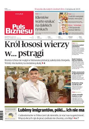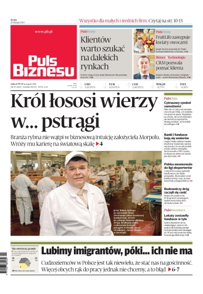 Król łososi wierzy w pstrągi – branża rybna nie wątpi w biznesową intuicję założyciela Morpolu, wróży mu karierę na światową skalę; lubimy imigrantów, póki... ich nie ma – cudzoziemców w Polsce jest tak niewielu, że stać nas na gościnność, więcej obcych rąk do pracy jednak nie chcemy, a to błąd; klientów warto szukać na dalekich rynkach – pomóc mogą w tym misje biznesowe dla przedsiębiorców; FruitLife zastępuje kwiaty owocami – Sergii Virchis przeniósł do Polski koncept biznesowy z Ukrainy; cytrusowy symbol zamożności – mało kto w Unii je tak niewiele owoców jak Polak, a w dodatku ich spożycie spada – wyjątkiem są cytrusy, ale tu też dynamika nie zachwyca importerów – muszą poczekać, aż Kowalski się wzbogaci; Polska awansowała do ligi eksporterów – 2 mld EUR rocznej nadwyżki handlowej to nie dzieło przypadku – ekonomiści coraz śmielej mówią o tym, że nasz kraj trwale pożegnał deficyt.