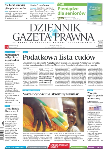 Podatkowa lista cudów – urząd skarbowy dla petenta, pieniądze należy zbierać, a nie zabierać – postępowanie prowadzić zgodnie z zasadą zaufania do klienta – Ministerstwo Gospodarki zebrało pobożne życzenia; ministerstwo zabłądziło w ślepej kuchni – w tym samym pomieszczeniu co salon nie może być kuchni – musi być oddzielnie, choćby ślepa i w przedpokoju – tak resort infrastruktury interpretuje rozporządzenie w sprawie warunków technicznych dla budynków; domy dziecka dla starszych – od 2015 r. w domach dziecka będą mogli przebywać podopieczni od 7 lat; nasza hojność ma skromny wymiar – Ukraina liczy na to, że Polska będzie miała duży udział w pomocy finansowej, jakiej udzieli jej Europa – ale jeśli coś od nas dostanie, to solidną pożyczkę, nie darowiznę; śmierć telefonów – smartfony z czytnikami linii papilarnych, odporne na wodę i kurz, w dodatku tanie, na każdą kieszeń – na Mobile World Congress w Barcelonie ogłoszono śmierć tradycyjnych aparatów, co przyjęto z entuzjazmem.
