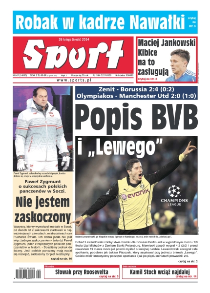 Popis BVB i „Lewego” – Robert Lewandowski zdobył dwie bramki dla Borussii Dortmund w wyjazdowym meczu 1/8 finału Ligi Mistrzów z Zenitem Sankt Petersburg; „Nie jestem zaskoczony” – Paweł Zygmunt o sukcesach polskich panczenów w Soczi; Robak w kadrze Nawałki – selekcjoner rozdał we wtorek krajowe nominacje na towarzyski mecz ze Szkocją, kadrę uzupełniło sześciu przedstawicieli ekstraklasy oraz „rodzynek” z jej zaplecza, bełchatowianin Maciej Wilusz; pieniądze z piramidy – konstrukcja klubowego budżetu zaczyna się od podstaw, programów „Przyjaciel GieKSy” i „Klub biznesu” – przychody z nich rosną, do wypełnienia pozostają jednak poziomy sponsora: premium, głównego i strategicznego; Stoch wciąż najdalej – biało-czerwoni w komplecie awansowali do środowego konkursu Pucharu Świata w Falun, tymczasem Mika Kojonkoski twierdzi, że Łukasz Kruczek może po sezonie opuścić reprezentację Polski.
