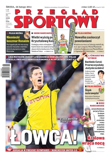 Łowca – Robert Lewandowski dobijał Rosjan, Polak strzelił dwa gole i Borussia pokonała na wyjeździe Zenit 4-2; niemiecki koszmar Ronaldo – Portugalczyk nie ma szczęścia do meczów z niemieckimi drużynami w Lidze Mistrzów; wielki wyścig po Kryształową Kulę – podwójny mistrz olimpijski z Soczi Kamil Stoch nie zwalnia tempa – Polak skacze dziś w konkursie o Puchar Świata w Falun; Nawałka zaskoczył powołaniami – w kadrze na mecz ze Szkocją znaleźli się m.in. Igor Lewczuk, Michał Masłowski z Zawiszy Bydgoszcz oraz Maciej Wilusz z I-ligowego GKS Bełchatów; Śląsk na krawędzi – były mistrz Polski jest w potężnym kryzysie; królowa wraca nocą – Justyna Kowalczyk jest już w Polsce – ze złotym medalem z Soczi przyleciała w nocy i pojechała do szpitala na badania kontuzjowanej stopy.