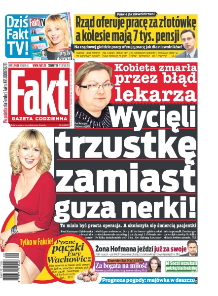 Wycięli trzustkę zamiast guza nerki – to miała być prosta operacja, a skończyła się śmiercią pacjentką; żona Hofmana jeździ już za swoje – fakt nauczył, pani Hofmanowa nie płaci już za taksówki sejmowymi pieniędzmi; Dominika Kulczyk za bogata na miłość – nie wierzy, że ktoś pokocha ją, a nie jej miliony; w Soczi oszukali polską biatlonistkę; rząd oferuje pracę za złotówkę a kolesie mają 7 tys. pensji – na rządowej giełdzie pracy oferują pracę jak dla niewolników!; pyszne pączki Ewy Wachowicz – miss ujawnia w Fakcie swój przepis na jędrne, smaczne i zdrowe polskie pączki, sekretnym składnikiem jest...
