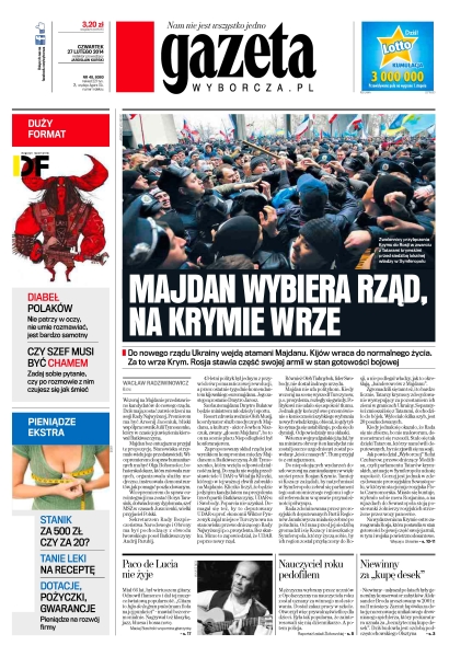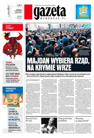 Majdan wybiera rząd, na Krymie wrze – do nowego rządu Ukrainy wejdą atamani Majdanu, Kijów wraca do normalnego życia, za to wrze Krym – Rosja stawia część swojej armii w stan gotowości bojowej; Paco de Lucia nie żyje – miał 66 lat, był wirtuozem gitary, odnowił flamenco i dał tej muzyce światową popularność; nauczyciel roku pedofilem – mężczyzna wybrany przez uczniów z Opolszczyzny na nauczyciela roku został uznany za winnego molestowania; niewinny za „kupę desek” – „Niewinny” – usłyszał po latach były generalny konserwator zabytków Aleksander Broda aresztowany w 2001 r. na 11 miesięcy; diabeł Polaków – nie patrzy w oczy, nie umie rozmawiać, jest bardzo samotny; czy szef musi być chamem – zadaj sobie pytanie, czy po rozmowie z nim czujesz się jak śmieć.