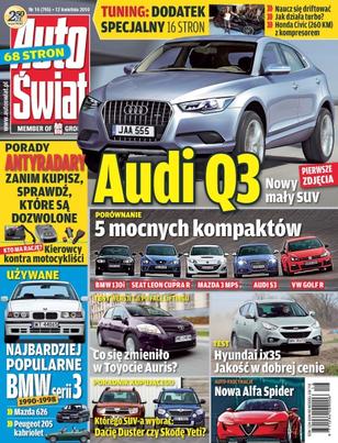 Audi Q3 wyróżniać się będzie bardziej dynamiczną stylistyką nadwozia; podczas salonu w Nowym Jorku zaprezentowano odmłodzoną Imprezę WRX STI; w Infinity QX nawet 8 osób może podróżować w komfortowych warunkach; podczas Rajdu Elmot ruszy druga polska edycja międzynarodowego pucharu Citroën Racing Trophy; porównanie pięciu supersportowych kompaktów; od kwietnia w salonach dostępna jest Toyota Auris po liftingu; Hyundai konsekwentnie udowadnia, że potrafi produkować samochody na najwyższym światowym poziomie; wiosna to ulubiona pora roku fanów tuningu, bowiem zimowe projekty wyjeżdżają na ulice; 260 KM w aucie ważącym 900 kg; jak usunąć przykre zapachy z kabiny samochodu; jak sprawdzić stan powypadkowego auta; Alfa Romeo 2uettottanta to prezent na setne urodziny powstania marki.