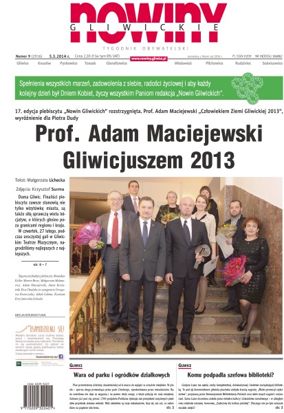 Profesor Adam Maciejewski Gliwicjuszem 2013 – 17. edycja plebiscytu „Nowin Gliwickich” rozstrzygnięta, profesor Adam Maciejewski „Człowiekiem Ziemi Gliwickiej 2013”, wyróżnienie dla Piotra Dudy; wara od parku i ogródków działkowych – plan przestrzenny dzielnicy akademickiej od 6 marca do wglądu w urzędzie miejskim, w planie sporna droga prowadząca przez park Chrobrego, oprotestowana przez mieszkańców – rada osiedlowa nie daje za wygraną i na pewno złoży uwagi, a także petycję do rady miejskiej; komu podpadła szefowa biblioteki – Grażyna Lazar ma opinię osoby kompetentnej, doświadczonej i świetnie zarządzającej biblioteką, dlaczego rok po zdobyciu trzeciej nagrody „Mistrza promocji czytelnictwa” musiała odejść; z garażu do szpitala – 80-letni pan Ludwik, który od 13 lat mieszka w jednym z garaży przy ul. Damrota wreszcie będzie mógł żyć w bardziej godnych warunkach.