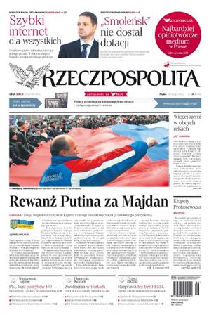 Rewanż Putina za Majdan – Rosja wspiera autonomię Krymu i uznaje Janukowycza za prawowitego prezydenta; szybki internet dla wszystkich – urzędowe sprawy załatwimy, używając jednego portalu, w jednym miejscu będą też zebrane informacje publiczne; „Smoleńsk” nie dostał dotacji – komisji nie spodobał się scenariusz filmu Antoniego Krauzego, aby obraz powstał, twórcy musieliby znaleźć pieniądze sami; Więcej ziemi w obcych rękach – obcokrajowcy mają w Polsce cztery razy więcej gruntów, niż to wynika z rejestrów MSW – odkryła Najwyższa Izba Kontroli, do której raportu dotarła „Rzeczpospolita”; kłopoty Protasiewicza – na lotnisku we Frankfurcie szef kampanii Platformy do europarlamentu wdał się w awanturę z celnikami; PSL kusi polityków PO – eurowybory: Ludowcy zapraszają na listy; zwolnienia w Portach – pracę straci co czwarty zatrudniony; rozprawa też bez PESEL – sąd nie zawsze zawiesi postępowanie.