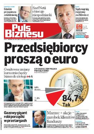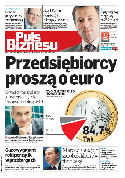 Michał Szubski, prezes PGNiG, odpiera najpoważniejsze zarzuty dostawców rur i zarzuca im celowe działanie na niekorzyść gazowego giganta; sześć na siedem polskich firm chce szybkiego przyjęcia unijnej waluty; Gdańsk chce w drugiej połowie roku podpisać wstępną umowę w sprawie budowy elektrowni w Porcie Północnym; szykuje się rewolucja w polskim wymiarze sprawiedliwości; Lotos myśli o sprzedaży części obowiązkowych zapasów paliw.