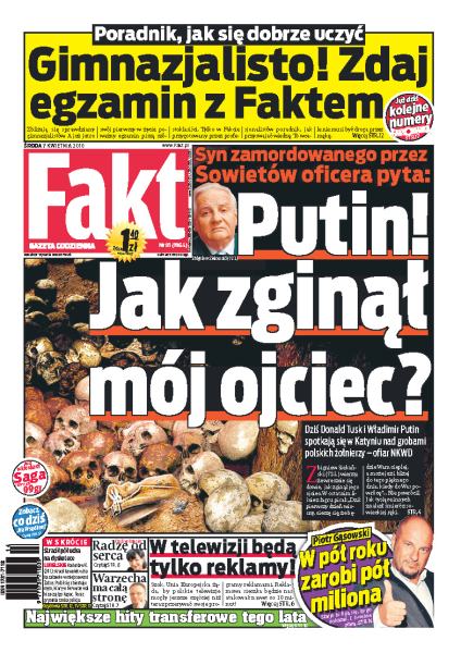 Czy siedemdziesiąt lat po zbrodni katyńskiej władze Rosji są zdolne, aby oficjalnie przeprosić Polskę za wymordowanie naszych żołnierzy; Bruksela chce złagodzić przepisy, tak by bloki reklamowe w telewizji mogły być nadawane co 10 minut; tragiczny wybuch gazu we Wrocławiu; poradnik, który zapewni gimnazjaliście sukcesy w szkole; Piotr Gąsowski zarobi 500 tys. zł w pół roku; Tomasz Karolak postanowił zmienić styl życia dla dobra rodziny.
