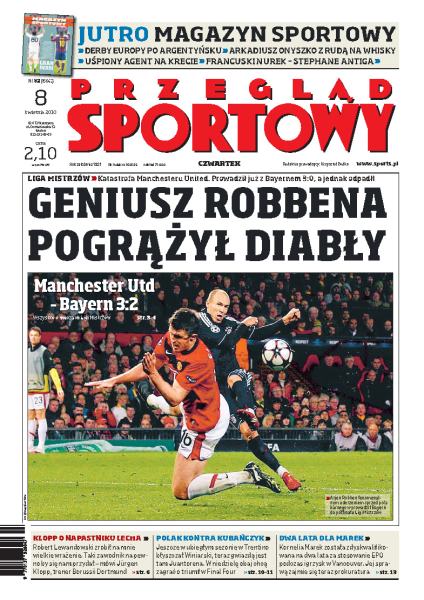 Manchester United po fantastycznym meczu pokonał Bayern Monachium 3:2, ale nie udało mu się awansować go półfinału Ligi Mistrzów; Michel Platini kontroluje postępy w przygotowaniach Ukrainy do EURO 2012; po fenomenalnym występie w meczu przeciwko Arsenalowi Leo Messi jest na ustach całej Europy; wywiad z Markiem Jóźwiakiem, dyrektorem sportowym Legii Warszawa; Kornelia Marek została zdyskwalifikowana na dwa lata.