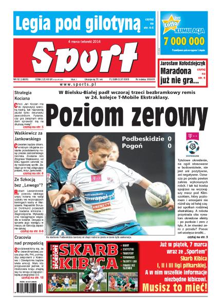 W Bielsku-Białej padł wczoraj trzeci bezbramkowy remis w 24. kolejce T-Mobile Ekstraklasy; Legia pod gilotyną; hokeiści Cracovii nad przepaścią; czwartek będzie dniem, w którym oficjalnie zostanie przedstawiony nowy prezes zabrzańskiego Górnika; ze Szkocją bez „Lewego”; przemyślana strategia trenera Ruchu; PGE Skra Bełchatów przegrała półfinał Pucharu CEV; tylko jeden medal, srebrny Katarzyny Pawłowskiej w scratchu, przywiozą reprezentanci Polski z mistrzostw świata w kolarstwie torowym.