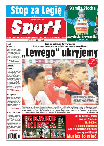 Dziś ze Szkocją gramy towarzysko - bez kontuzjowanego Roberta Lewandowskiego; Kamila Stocha zwycięska trzynastka; dziś decyzje po meczu Legii z Jagiellonią; mapa stadionowych chuliganów; Artur Sobiech nabawił się na treningu poważnego urazu kolana; Górnik Zabrze ma nowego prezesa; jeszcze przed niedzielnym meczem z Podbeskidziem rada nadzorcza Piasta Gliwice chce się spotkać z trenerami Marcinem Broszem i Dariuszem Dudkiem; hokeiści Cracovii, obrońcy tytułu, nie poddają się – wczoraj zmniejszyli straty w play offie na 1-2; halowe mistrzostwa świata w lekkiej atletyce w Sopocie za dwa dni.