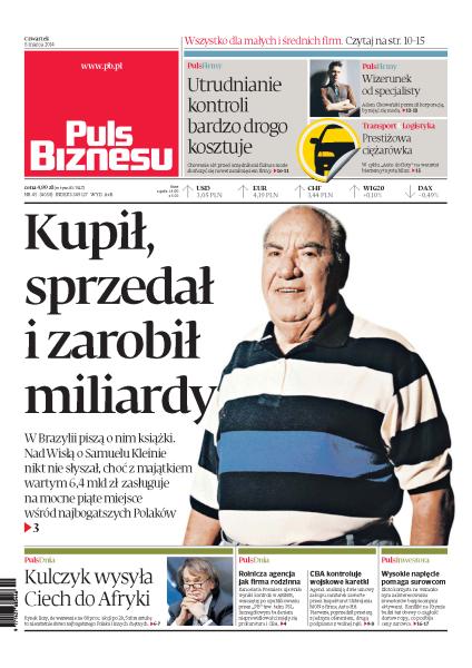 W Brazylii piszą o nim książki, ale nad Wisłą o Samuelu Kleinie nikt nie słyszał, choć z majątkiem wartym 6,4 mld zł zasługuje na mocne piąte miejsce wśród najbogatszych Polaków; utrudnianie kontroli fiskusa bardzo drogo kosztuje; Kulczyk wysyła Ciech do Afryki; Kancelaria Premiera ujawniła wyniki kontroli w ARiMR, wszczętej po opublikowaniu przez „PB” tzw. taśm PSL – szczegółowym badaniem nieprawidłowości zajęły się prokuratura i CBA; CBA kontroluje wojskowe karetki; złoto korzysta na wzmożonym zainteresowaniu inwestorów bezpiecznymi aktywami, konflikt na Krymie podbija też ceny ropy naftowej; na zakupy z osobistym przewodnikiem; jeśli nie uda się dojść do porozumienia w sprawie naruszeń gwarancji TIR w Rosji, państwo to może zostać wykluczone z systemu.