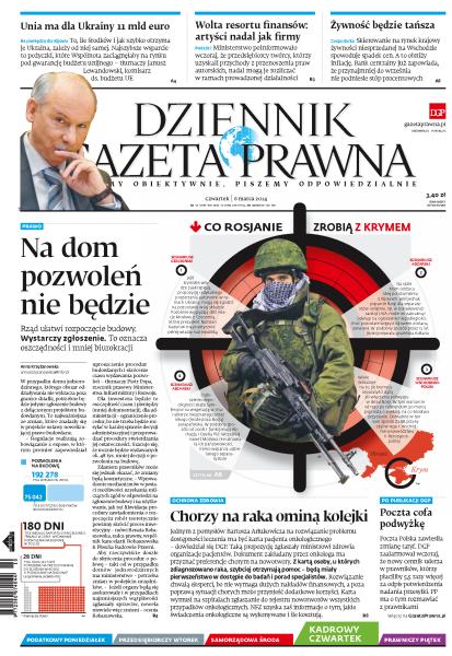 Co Rosjanie zrobią z Krymem; Unia ma dla Ukrainy 11 mld euro; na dom pozwoleń nie będzie – wystarczy zgłosić rozpoczęcie budowy; chorzy na raka ominą kolejki; wolta resortu finansów: artyści nadal jak firmy; żywność będzie tańsza; piratom drogowym recydywa się opłaca; Częstochowa w 2017 roku doczeka się obwodnicy; w telekomunikacji taniej może oznaczać drożej; sodowe wyzwanie Kulczyka: wezwanie do sprzedaży 66% pakietu akcji Ciechu.