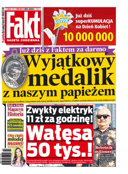 Zwykły elektryk 11 zł za godzinę, a Wałęsa 50 tys.; oto ciało młodej mamy: Mucha kipi seksem; przez błędy lekarzy umierają dziennie 63 osoby; Pawlak poznał kochankę na Malcie; warszawska straż pilnuje auta szefa; rolnik spod Jarosławia zabił kochankę z Ukrainy; w sklepach nie ma polskich warzyw; bocian morderca zajączków; wojna z dopalaczami to fikcja; Majdan jeździ już taksówką; czy Kożuchowska będzie mamą; Stoch już w niedzielę może zdobyć Kryształową Kulę.