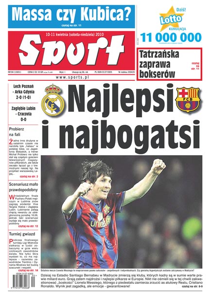 Najlepsi i najbogatsi – wielki mecz Realu z Barceloną; wywiad z Michałem Probierzem, trenerem Jagiellonii Białystok; Lech po zwycięstwie nad Arką krok za liderem; Zagłębie nie potrafiło poradzić sobie z Cracovią – mecz zakończył się remisem; Ruch Chorzów będzie podejmował Odrę Wodzisław; bagatelizowany mecz na szczycie między Zagłębiem Sosnowiec a Górnikiem Polkowice; Albert Sosnowski i Krzysztof Włodarczyk kończą wspólne zgrupowanie w Zakopanem przed swoimi mistrzowskimi walkami; czy Kubica zastąpi Massę w Ferrari; w niedzielnym finale Pucharu Polski w piłce ręcznej znów grają Vive Targi Kielce i Zagłębie Lubin; kluczem do sukcesu Skry Bełchatów w finale Final Four będzie zagrywka.