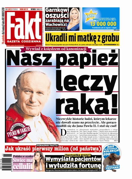 Niezwykłe historie ludzi, którym lekarze nie dawali szans na przeżycie, ale gorąco modlili się do Jana Pawła II i stał się cud; pijak Wipler może dostać 3 lata; jak ukraść pierwszy milion; Jarosław Wałęsa musi teraz nauczyć się godzić obowiązki europosła z opieką nad pierworodnym synem Wiktorem; kto zarabia na jeleniach; Kożuchowska odłożyła 2 mln zł na ciążę; Natalia Siwiec ma cellulit; żona Janowskiego nie trafi do celi; nasza najlepsza lekkoatletka w historii wyglądała kwitnąco w sopockiej hali; Kamil Stoch może się już objadać; w trakcie meczu Śląska z Legią doszło do rękoczynów pomiędzy zawodnikami zespołu z Warszawy; Agnieszka Radwańska awansowała do 1/8 finału turnieju w Indian Wells.