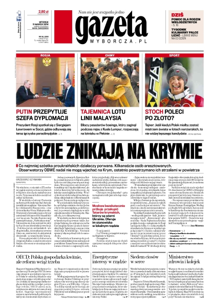 Co najmniej szóstka proukraińskich działaczy porwana, kilkanaście osób aresztowanych, a obserwatorzy OBWE nadal nie mogą wjechać na Krym, ostatnio powstrzymano ich strzałami w powietrze; klienci nocnych klubów Cocomo budzą się rano z rachunkami na kilkadziesiąt tysięcy złotych; Moskwa próbuje przekupić Tatarów krymskich, którzy zachowują wierność Ukrainie; dlaczego rodziny wielodzietne nie mają zbyt wielu przywilejów gwarantowanych przez państwo; dziś rząd zamierza przyjąć projekty przepisów, które mają ułatwić eksploatację gazu z łupków; jeśli polski skoczek miałby kiedykolwiek wygrać w mistrzostwach świata w lotach narciarskich, to nie widzę lepszego kandydata niż Kamil Stoch – mówi prezes PZN Apoloniusz Tajner.