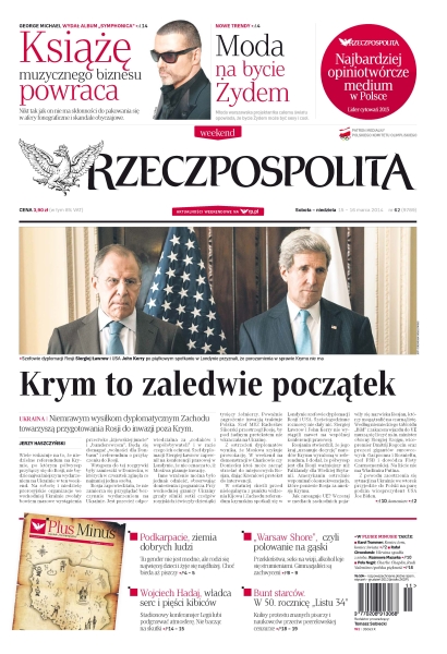 Niemrawym wysiłkom dyplomatycznym Zachodu towarzyszą przygotowania Rosji do inwazji poza Krym; Marszałek Struzik tonął wraz z bankrutującym województwem – Dziś rzuca wyzwanie rządowi; Warszawianka Antonina Samecka chce przekonać świat do nowego trendu; Do dużych miast za pracą i lepszym życiem wyprowadzają się młodzi ludzie – Za nimi podążają rodzice; Jak adwokaci wygrywają sprawy w pięć minut; Przygotowania do powtórki krymskiego scenariusza na wschodzie Ukrainy; George Michael powraca albumem „Symphonica”; Jedna z najważniejszych przepraw morskich świata po modernizacji podwoi swoje możliwości; Skrzyżowanie balonu, sterowca i dronu zbudują inżynierowie włoscy oraz francuscy – poszybuje w stratosferze.