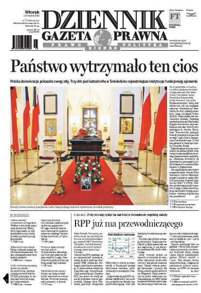 Polska demokracja pokazała swoją siłę, trzy dni po katastrofie w Smoleńsku najwyższe instytucje funkcjonują sprawnie; w wyniku kryzysu Polacy unikają jednorazowych, dużych zakupów; co 10. hurtownia sprzedaje paliwo złej jakości; Rada Polityki Pieniężnej zebrała się po raz pierwszy bez prezesa NBP; jakie prawa ma turysta na lotnisku, co zrobić w przypadku opóźnienia lotu lub zagubienia bagażu; jakie nowe prawa zyskają wykonawcy i podwykonawcy robót budowlanych; więcej niesolidnych dłużników trafi na czarne listy biur informacji gospodarczej.