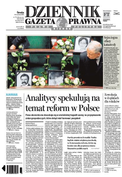 Prasa ekonomiczna doszukuje się w smoleńskiej tragedii szansy na przyśpieszenie zmian gospodarczych; pomoc dla rodzin ofiar katastrofy pod Smoleńskiem nie będzie opodatkowana; polscy maturzyści najchętniej wybierają studia techniczne; o czym musi pamiętać podatnik, by urząd skarbowy nie zakwestionował ulgi internetowej; do 30. kwietnia samorządowcy muszą złożyć oświadczenie o stanie majątku.