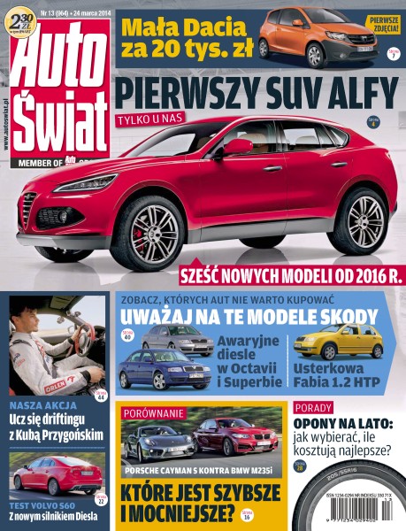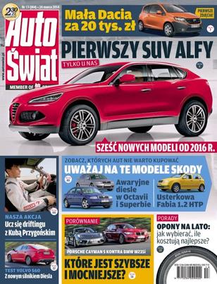 Pierwszy SUV Alfy – zupełnie inaczej niż pierwotnie planowano, nowa Alfa Spider nie będzie bliźniakiem Mazdy MX-5, lecz w pełni własnym projektem Włochów; małe auto za 20 000 zł – gdy 10 lat temu pojawił się Logan, rynek motoryzacyjny w Europie zmienił się diametralnie, czy tanie miejskie autko od Dacii także będzie miało takie oddziaływanie; ryzykowne auta na literę S – w drugiej części ryzykownych aut na literę S opisujemy Skody, Subaru i Suzuki, kolejny raz okazuje się, że nawet renomowani producenci mają grzechy na sumieniu; odświeżone z nowym napędem – poliftingowe Volvo S60 oprócz zmian stylistycznych otrzymało nową rodzinę silników Drive-E oraz 8-stopniowy „automat” – w ramach testu wersji wysokoprężnej D4 sprawdzamy, czy ta para tworzy zgrany zespół.