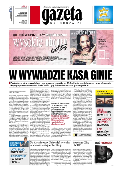 Pieniądze na tajne operacje były rozkradane od początku lat 90, brali w tym udział wysocy rangą oficerowie – najwięcej zdefraudowano w 1994 i 2003 r.; na Krymie wrze, Unia wciąż się waha w sprawie sankcji wobec Rosji; wyrok na CBA i IV RP; rząd obrzydza leczenie za granicą, ale coraz więcej pacjentów korzysta z tej możliwości i przed sądem dochodzi od NFZ zwrotu kosztów; zakaz uboju rytualnego nie narusza konstytucji ani konwencji praw człowieka.