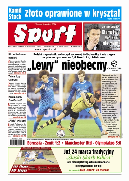 „Lewy” nieobecny – polski napastnik zobaczył wczoraj żółtą kartkę i nie zagra w pierwszym meczu 1/4 finału Ligi Mistrzów; Stowarzyszenie Kibiców Wisły Kraków wypowiedziało wojnę klubowi; zarząd Górnika Zabrze nic nie wiedział o wyjeździe Pawła Olkowskiego na badania do Koloni; Ukraina oficjalnie zrezygnowała z organizacji przyszłorocznych mistrzostw Europy mężczyzn w koszykówce; Urszula Radwańska, Katarzyna Piter, Łukasz Kubot i Michał Przysiężny - czworo z sześciorga Polaków zainaugurowało i od razu zakończyło udział w turnieju tenisowym w Miami.