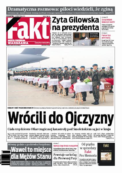 Odtworzono zapis czarnych skrzynek prezydenckiego samolotu, zawierają one również wstrząsające nagranie głosów w kabinie w ostatnich minutach lotu; Donald Tusk oraz inni członkowie rządu pełnili wartę przy trumnach Prezydenta i Pierwszej Damy; ciała trzydziestu ofiar tragicznej katastrofy pod Smoleńskiem są już w kraju; czy ciało Lecha Kaczyńskiego powinno spocząć na Wawelu; najważniejsze osobistości z całego świata przybędą do Polski na uroczystości pogrzebowe.