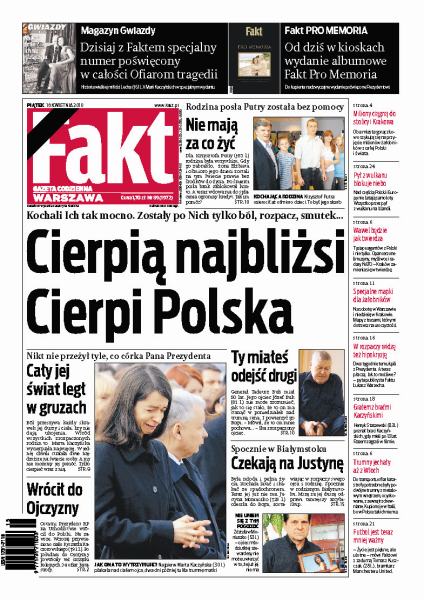 Marta Kaczyńska wycierpiała najwięcej, jak będzie wyglądało jej życie po stracie rodziców; ciało Ryszarda Kaczorowskiego, ostatniego prezydenta RP na uchodźstwie, wróciło do Polski; Warszawa i Kraków gorączkowo szykują się na przyjęcie milionów żałobników z całej Polski i ze świata; rodzina posła Putry została bez środków do życia; nad częścią Polski i Europy nie latają samoloty, wszystko przez wulkan na Islandii.