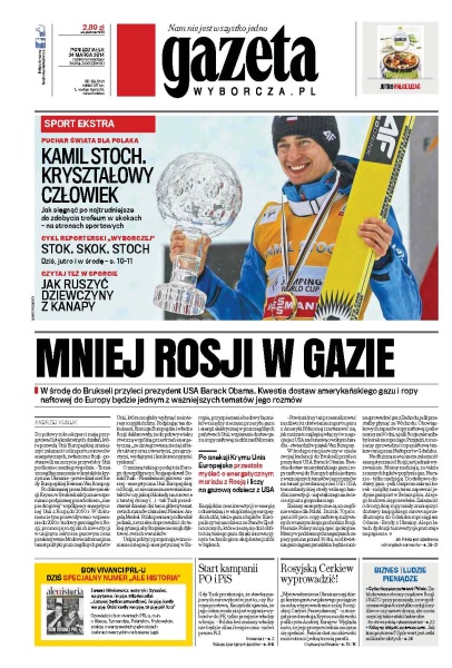 Mniej Rosji w gazie – w środę do Brukseli przyleci prezydent USA Barack Obama, kwestia dostaw amerykańskiego gazu i ropy naftowej do Europy będzie jednym z ważniejszych tematów jego rozmów; Kamil Stoch, kryształowy człowiek – jak sięgnąć po najtrudniejsze do zdobycia trofeum w skokach – na stronach sportowych; start kampanii PO i PiS – gdy Tusk przekonuje, że stawką majowych eurowyborów jest to, czy Europa przetrwa, Kaczyński ujawnia, że jego celem wcale nie jest wygranie wyborów do PE, tylko przeję cie władzy w kraju; rosyjską Cerkiew wyprowadzić – „Wprowadzenie na Ukrainę rosyjskiego kontyngentu wojskowego pociągnie za sobą wyprowadzenie z niej Rosyjskiej Cerkwi Prawosławnej” – ostrzegał przed aneksją Krymu moskiewski publicysta Andriej Kurajew; cyberbezpieczeństwo Polski – zablokowane strony rządowe Rosji i NATO przypomniały, że współczesna wojna to nie tylko czołgi i myśliwce czy nawet drony, ale coraz częściej także ataki hakerskie.