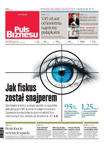 Jak fiskus został snajperem – skarbówka w końcu znalazła sposób na oszustów wyłudzających VAT w coraz to nowych branżach, typowanie kandydatów do kontroli wśród firm z wirtualnych biur okazało się strzałem w „10”; bezrobocie wreszcie spada – po latach regresu rynek pracy odbił się od dna, na koniec lutego bezrobotnych było o 3,5 proc. mniej niż przed rokiem; VAT od aut od kwietnia najeżony pułapkami – jednorazowa wyprawa do lekarza służbowym autem może mieć poważne konsekwencje; rząd zaniedbał darmowe CO2 – opieszałość urzędników, którzy nie przygotowali na czas rozporządzenia o darmowych uprawnieniach do emisji, naraża firmy na ogromne straty; BSH chce przejąć zakład Mastercooka – Zelmer to za mało dla Bosch und Siemens Hausgeraete, gigant poprosił UOKiK o zgodę na przejęcie części mienia Fagora – choć rywale są zaskoczeni, ta układanka ma sens; prezes Serenity usłyszał zarzuty – po trwającym ponad rok śledztwie sprawa firmy, która rozbudziła wyobraźnię inwestorów wizją wybudowania sieci domów starości, trafiła do sądu; TFI chcą zarabiać na wynajmie lokali – fundusze nieruchomościowe nie wyrobiły sobie dobrej opinii u inwestorów, następcy chcą to zmienić – proponują klientom stabilny zysk podobny do dywidendy.