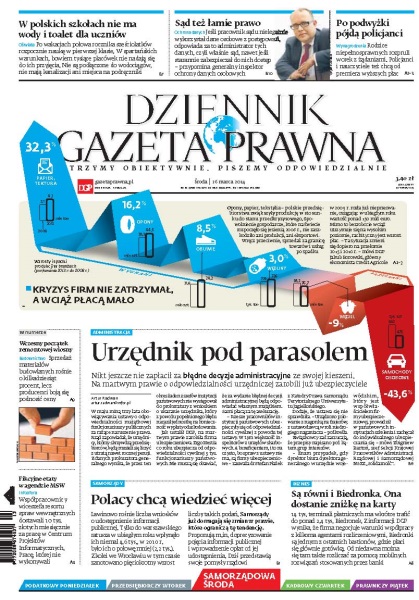 Urzędnik pod parasolem – nikt jeszcze nie zapłacił za błędne decyzje administracyjne ze swojej kieszeni, na martwym prawie o odpowiedzialności urzędniczej zarobili już ubezpieczyciele; Polacy chcą wiedzieć więcej – lawinowo rośnie liczba wniosków o udostępnienie informacji publicznej, tylko do warszawskiego ratusza w ubiegłym roku wpłynęło ich niemal 4,6 tys., w 2010 r. było ich o połowę mniej; są równi i Biedronka, ona dostanie zniżkę na karty – 14 tysięcy terminali płatniczych ma wkrótce trafić do ponad 2,4 tys. Biedronek – z informacji DGP wynika, że firma negocjuje warunki współpracy z kilkoma agentami rozliczeniowymi – Biedronki są jednym z ostatnich bastionów, gdzie płaci się głównie gotówką; w polskich szkołach nie ma wody i toalet dla uczniów – po wakacjach połowa rocznika sześciolatków rozpocznie naukę w pierwszej klasie, w spartańskich warunkach, bowiem tysiące placówek nie nadają się do ich przyjęcia.