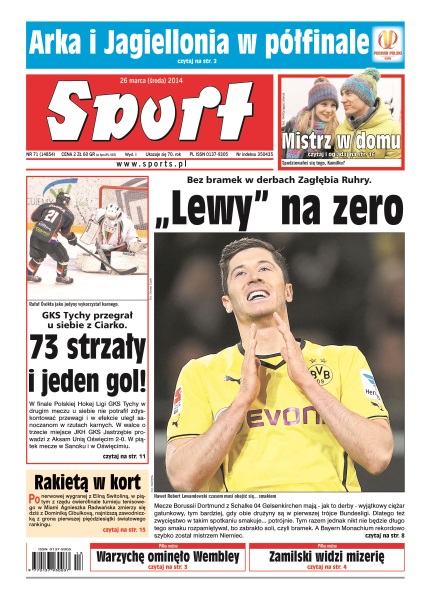„Lewy” na zero – bez bramek w derbach Zagłębia Ruhry; 73 strzały i jeden gol – GKS Tychy przegrał u siebie z Ciarko; rakietą w kort – po nerwowej wygranej z Eliną Switoliną, w piątym z rzędu ćwierćfinale turnieju tenisowego w Miami Agnieszka Radwańska zmierzy się dziś z Dominiką Cibulkovą, najniższą zawodniczką z grona pierwszej pięćdziesiątki światowego rankingu; pożegnanie Seedorfa – Holender w niedzielę był obiektem rasistowskich ataków, dzisiaj zapewne po raz ostatni poprowadzi Milan; czy zataił kontuzję – mężczyźni rozpoczynają drugą część sezonu, obrońca tytułu, Stelmet, musi sobie poradzić bez Terrella Stoglina; Ząb zimową stolicą – kilka tysięcy ludzi powitało dwukrotnego złotego medalistę igrzysk w Soczi i zdobywcę Pucharu Świata, Kamila Stocha, oraz jego kolegów i koleżanki z reprezentacji olimpijskiej.