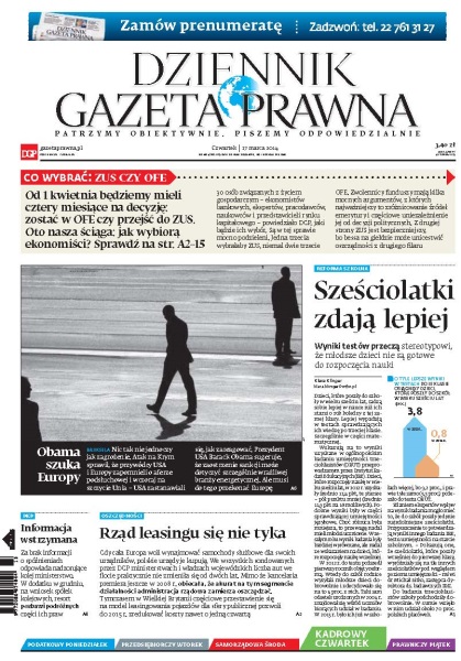 Sześciolatki zdają lepiej – wyniki testów przeczą stereotypowi, że młodsze dzieci nie są gotowe do rozpoczęcia nauki; rząd leasingu się nie tyka – gdy cała Europa woli wynajmować samochody służbowe dla swoich urzędników, polskie urzędy je kupują – we wszystkich sondowanych przez DGP ministerstwach i władzach wojewódzkich liczba aut we flocie praktycznie nie zmieniła się od dwóch lat; informacja wstrzymana – za brak informacji o spóźnieniach odpowiada nadzorujące kolej ministerstwo, w dodatku w grudniu, na wniosek spółek kolejowych, resort pozbawi podróżnych części ich praw; od 1 kwietnia będziemy mieli cztery miesiące na decyzję: zostać w OFE czy przejść do ZUS – oto nasza ściąga: jak wybiorą ekonomiści.