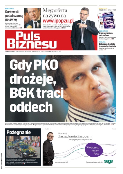 Już za kilkadziesiąt godzin wystartuje przyspieszona kampania wyborcza; grupa energetyczna z Poznania chce startować po drugą lokalizację dla elektrowni jądrowej; resort żałuje 56 mln zł na granty dla inwestorów, którzy chcą zostawić 30 razy więcej; stacje szukają dochodów utraconych w czasie narodowej żałoby; zwolnienia grupowe w Eurobanku – pracę może stracić 130 osób z przeszło 3 tys. zatrudnionych; PZU czeka 555 spotkań z inwestorami na całym świecie; biura maklerskie prześcigają się w promocjach, by ściągnąć nowych akcjonariuszy PZU do siebie; już dzisiaj regulator rynku zadecyduje o być albo nie być krótkiej sprzedaży na warszawskiej giełdzie; polskie małe i średnie przedsiębiorstwa zaawansowanymi technologicznie produktami podbijają rynki Chin, Australii i RPA.