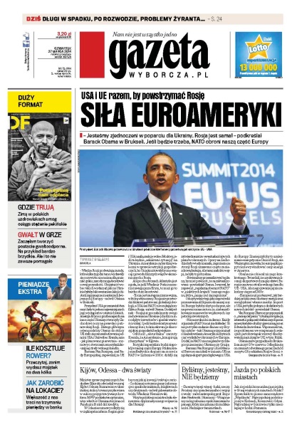 Siła Euroameryki – „Jesteśmy zjednoczeni w poparciu dla Ukrainy. Rosja jest sama!” – podkreślał Barack Obama w Brukseli – jeśli będzie trzeba, NATO obroni naszą część Europy; Kijów, Odessa – dwa światy – minister spraw zagranicznych Radosław Sikorski odwiedził wczoraj Kijów i Odessę – rozmowom w ukraińskiej stolicy towarzyszyła wiara w sukces przygotowywanych reform; byliśmy, jesteśmy, NIE będziemy – „Chcemy więcej iwięcej – ludzi, rzeczy. Prosimy się o pandemię albo o wojny o wodę” –mówi antropolog prof. Bogusław Pawłowski; jazda po polskich miastach – jak się jeździ komunikacją miejską w 19 największych miastach Polski – sprawdziło to pismo samorządowe „Wspólnota”; gdzie trują – zimą w polskich uzdrowiskach smog osiąga stężenie pekińskie.