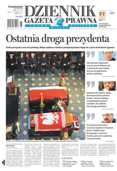 Polska pożegnała Lecha Kaczyńskiego; minęła najdłuższa żałoba w powojennej historii – nigdy tak często nie bił dzwon Zygmunta; polscy intelektualiści piszą list do Rosjan z prośbą o pojednanie; Polska pokazała, że mimo tragedii państwo może sprawnie działać; w przyszłości Katyń powinien stać się świętym miejscem dla kolejnych pokoleń Rosjan; wybuchy z islandzkiego wulkanu sparaliżowały lotniska w 13 państwach Europy; dziś mija pięć lat od wyboru kardynała Ratzingera na papieża Benedykta XVI; w tym tygodniu marszałek Bronisław Komorowski ma ogłosić, kiedy zostanie wybrany nowy prezes banku centralnego; dzisiaj PZU ogłosi maksymalną cenę akcji; kiedy i na jakich zasadach pracownik nabywa prawo do zasiłku chorobowego; firmy nie chcą płacić składek na emerytury pomostowe.