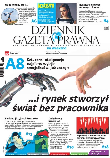 ...i rynek stworzył świat bez pracownika – sztuczna inteligencja najpierw wybije specjalistów, już zaczęła; ranking fikcyjnych krezusów – co roku amerykański „Forbes” robi zestawienie najbogatszych bohaterów światowej, a w praktyce głównie amerykańskiej popkultury – dlaczego by więc nie spróbować czegoś podobnego u nas – tylko w DGP subiektywna lista najbogatszych postaci polskiej literatury i filmu; związkowcy kontra Lidl – wywiad ze zwolnioną szefową związku i odpowiedź Lidla; niepotrzebny ten LOT – LOT płynność finansową tracił już dwa razy, jednak dzięki szczodrości państwa trwa; Trybunał przeciwko sieciowym piratom – można nakazać dostawcy internetu zablokowanie dostępu do stron łamiących prawa autorskie, orzekł luksemburski Trybunał Sprawiedliwości.