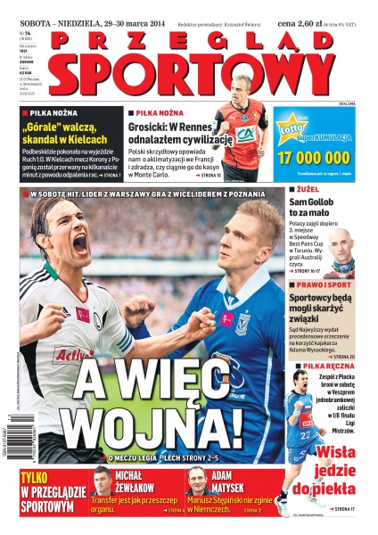 A więc wojna – w sobotę hit, lider z Warszawy gra z wiceliderem z Poznania; sam Gollob to za mało – Polacy zajęli dopiero 3. miejsce w Speedway Best Pairs Cup w Toruniu – wygrali Australijczycy; sportowcy będą mogli skarżyć związki – Sąd Najwyższy wydał precedensowe orzeczenie na korzyść kajakarza Adama Wysockiego; Wisła jedzie do piekła – zespół z Płocka broni w sobotę w Veszprem jednobramkowej zaliczki w 1/8 finału Ligi Mistrzów; „Górale” walczą, skandal w Kielcach – Podbeskidzie pokonało na wyjeździe Ruch 1:0, w Kielcach mecz Korony z Pogonią został przerwany na kilkanaście minut z powodu odpalenia rac; „W Rennes odnalazłem cywilizację” – polski skrzydłowy, Kamil Grosicki, opowiada nam o aklimatyzacji we Francji i zdradza, czy ciągnie go do kasyn w Monte Carlo.