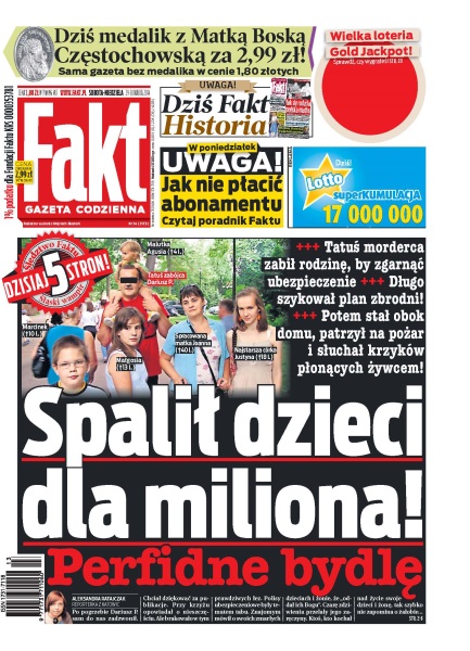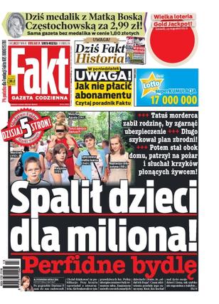 Spalił dzieci dla miliona, perfidne bydlę – tatuś morderca zabił rodzinę, by zgarnąć ubezpieczenie, długo szykował plan zbrodni, potem stał obok domu, patrzył na pożar i słuchał krzyków płonących żywcem; Krzysztof Ibisz walczy o pieniądze z byłymi żonami – gwiazdor nie dogadał się z matkami swoich dzieci, przepychanki zakończą się w sądzie; tylko Lech może zatrzymać Legię – już dziś hit sezonu, pierwszy z meczów o tytuł mistrzowski; Lewy trenuje z żoną – Anna i Robert dają przykład jak należy się prowadzić; jak się rodziła polska mafia – lata 90 to złote czasy gangsterów, zarabiali niebotyczne pieniądze i byli bezkarni, bali się tylko siebie nawzajem, a porachunki załatwiali bombami.
