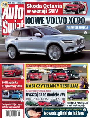 Volvo XC90 – nowa generacja szwedzkiego SUV-a; SUV-y Seata i Skody – rodzeństwo VW Tiguana; Peugeot 308 SW – pierwsza jazda kompaktowym kombi z Francji; Cadillac CTS i VW Golf R – wrażenia z jazd nowymi wersjami; wydarzenia sportowe – powrót Peugeota do Rajdu Dakar; Hyundai i10 kontra VW up – porównanie popularnych aut miejskich; zmień kolor felg – dla kogo folia w spreju; Honda CR-V (2006-12) – prezentacja wszystkich wersji modelu.