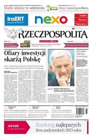 Tysiące firm wywłaszczonych pod drogi nie dostało odszkodowań za straty, teraz chcą milionów w Strasburgu; Buzek: Putin liczy, że wyhamuje impet Zachodu; specjaliści opłacani coraz lepiej: wysoko wykwalifikowany pracownik czy menedżer dostawał w 2013 na dzień dobry ponad 10 tys. zł brutto, to o prawie 7 proc. więcej niż w 2012 r.; wrak Tu-154 jednak potrzebny – biegli nie wydadzą opinii bez szczątków; nowe cmentarze polskich żołnierzy z II wojny; Andrej Kiska zostanie słowackim prezydentem; Marek Magierowski: G8 z Chinami zamiast Rosji; rośnie krajowy popyt na żywność; karty zbliżeniowe tylko dla chętnych; KGHM optymistycznie o rynku miedzi; prywatny sprzęt jak służbowy; fiskus chce więcej karać – nieograniczone kontrole i grzywny; opór przeciw likwidacji sądowych referatów; gość prawnych stron „Rz”: Konstanty Radziwiłł; stres przeszkadza w pracy i dużo kosztuje firmy.