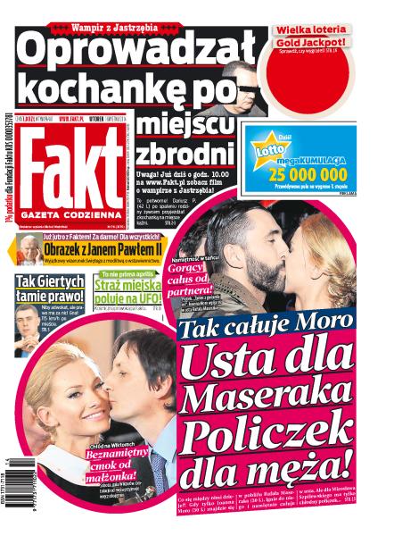 Tak całuje Moro: usta dla Maseraka, policzek dla męża; wampir z Jastrzębia oprowadzał kochankę po miejscu zbrodni; tak Giertych łamie prawo; to nie prima aprilis: straż miejska poluje na UFO; Rosja uzależniła całą Europę; rząd chce zakazać Polakom palenia; Tuskówna ubierze posłanki PiS; Czempiński: mój syn ma zespół Downa; absurdalna pomyłka sądu w Koszalinie: skazany za cudze długi; w jogurtach nie ma owoców, tylko sztuczne aromaty i zagęszczone soki; Tomasz Jacyków: leczyła mnie czarownica; Tajner dba o ukochaną; Robert Lewandowski jest najczęściej faulowanym piłkarzem w Bundeslidze.