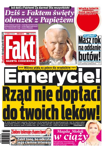 Rząd nie dopłaci emerytom do leków; masz rok na oddanie butów: koniec z matactwami sklepów, kombinujących z gwarancją i wymianą towaru; Ziobro toleruje, gdy jego ulubiony poseł parkuje jak ostatni cham; zabił żonę, bo odkryła jego ciemne interesy – oto dlaczego wydał wyrok na bliskich; Magda Mołek w ciąży; szok cenowy: pomidory droższe niż schab; luksusowe życie Kasi Tusk: zarabia 50 tys. zł, a śpi za nasze; Wałęsiątko ma wózek za 4000 zł; Kraków walczy o igrzyska: 18 mln za napisanie podania; kto ukradł tramwaj: z łódzkiego MPK śmieje się cała Polska.