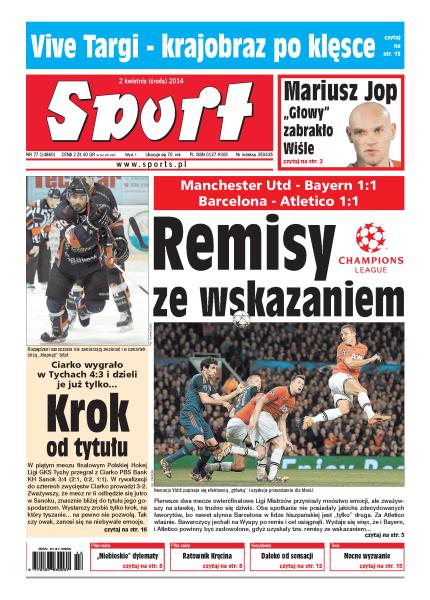 Manchester Utd - Bayern 1:1, Barcelona - Atletico 1:1 – remisy ze wskazaniem; Ciarko wygrało w Tychach 4:3 i dzieli je już tylko krok od tytułu mistrza Polski; Vive Targi Kielce – krajobraz po klęsce; Ruch Chorzów: wspólne piwo, kręgle, spotkanie integracyjne z partnerkami oraz gra najlepszymi aktualnie zawodnikami - to recepta byłych piłkarzy na przełamanie zaskakującej serii trzech ligowych porażek z rzędu; żużel: liderem ROW-u Rybnik ma być Chris Harris, prezes klubu zapowiada walkę o awans, jednak trener Jan Grabowski i eksperci tonują nastroje; brak Wisły Can-Pack Kraków czy CCC Polkowice w finale mistrzostw Polski byłby ogromną sensacją – koszykarki rozpoczynają dzisiaj walkę o medale; BNP Paribas Katowice Open: turniej w „Spodku” będzie pierwszym na świecie, w którym w jego trakcie w ciągu kilku godzin z dwóch kortów musi powstać jeden.