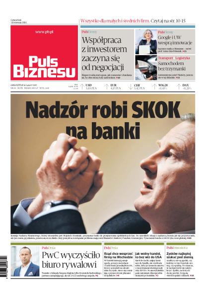 Komisja Nadzoru Finansowego przymusza banki do przejmowania spółdzielczych kas – zdaniem banków KNF posuwa się za daleko; eksperci radzą start-upom, jak rozmawiać z funduszami, by obie strony były zadowolone; Google i UW wesprą innowacje; autonomiczne auta niestety jeszcze nie w tej dekadzie; transfer z Rolanda Bergera do PwC objął nie tylko Krzysztofa Badowskiego, partnera zarządzającego, ale też 3/4 20-osobowego zespołu; rząd chce wesprzeć firmy na Wschodzie; Karel de Gucht, unijny komisarz ds. handlu, nie wyobraża sobie, żeby po zawarciu umowy z Amerykanami obowiązywały wizy do USA; analitycy nie są zgodni, czy indeksy w tym kwartale urosną, czy spadną spółki, na których da się zarobić, kryją się wśród kopalni i rafinerii.