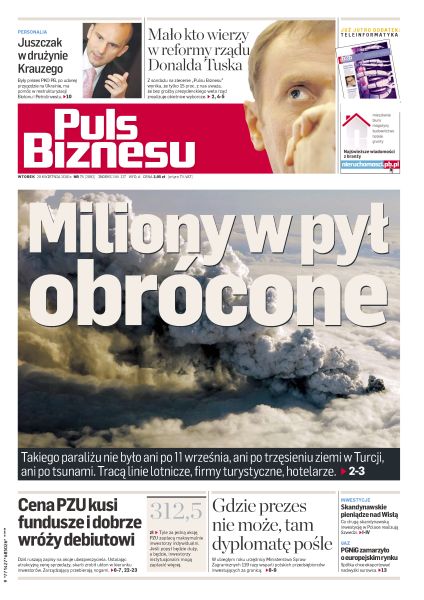 Takiego paraliżu nie było ani po 11 września, ani po trzęsieniu ziemi w Turcji, ani po tsunami – tracą linie lotnicze, firmy turystyczne, hotelarze; fundusze rwą się do zakupów akcji PZU; Rafał Juszczak został wiceprezesem w grupie Ryszarda Krauzego; Michał Szubski przygotowuje PGNiG do wejścia na europejski rynek spot; poprawia się koniunktura w budownictwie mieszkaniowym; na niektórych lokalnych rynkach nieruchomości już przybywa transakcji, na innych trwa wyczekiwanie; w Moskwie najszybciej przybywa nowych obiektów handlowych; oferta PZU cieszy się dużym zainteresowaniem nie tylko wśród inwestorów z doświadczeniem; program „Catching the Future” ma pokazać przedsiębiorcom z Polski i Szwecji możliwości współpracy.