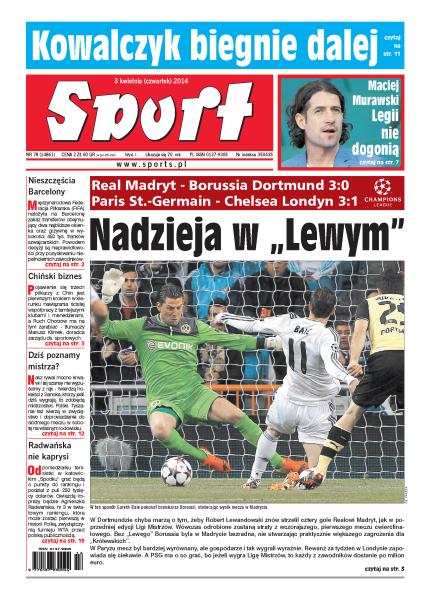 Real Madryt - Borussia Dortmund 3:0, Paris St.-Germain - Chelsea Londyn 3:1 – cała nadziej dortmundczyków w Robercie Lewandowskim; Justyna Kowalczyk nie kończy kariery sportowej; Ruch Chorzów: pojawienie się trzech piłkarzy z Chin jest pierwszym krokiem w kierunku nawiązania ścisłej współpracy z tamtejszymi klubami i menedżerami; czy dziś poznamy mistrza kraju w hokeju; Radwańska nie kaprysi, będzie gwiazdą imprezy w Katowicach; Międzynarodowa Federacja Piłkarska (FIFA) nałożyła na Barcelonę zakaz transferów obejmujący dwa najbliższe okienka; koszykówka kobiet: od ogromnej niespodzianki rozpoczęła się walka o medale, bo Artego Bydgoszcz wygrało z CCC.